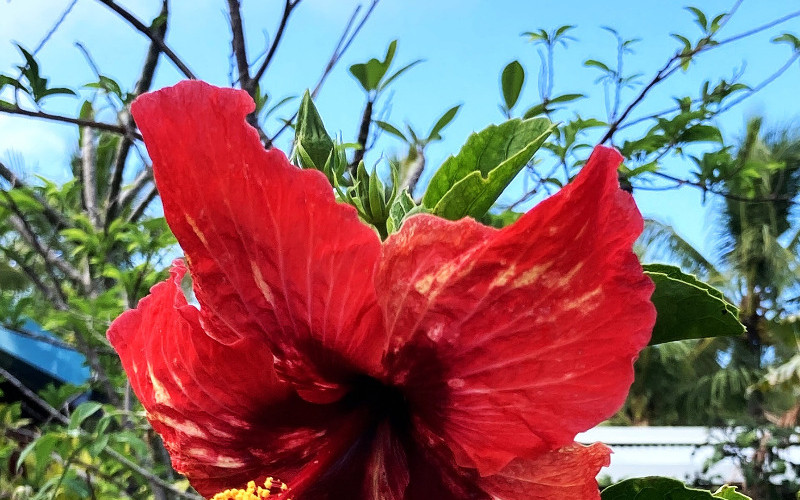La route qui longe la plage est « coaltarée » (asphaltée, en v.o. caldoche). Un panneau solaire coiffe chaque réverbère. Walles me l’avait dit : l’île est autosuffisante en électricité comme en eau potable. Effectivement, les maisons sont flanquées de tuyauteries en PVC guidant les eaux de pluie jusqu’à de vastes cuves, équipées de filtres. Beaucoup sont pleines. Sous l’averse, le trop-plein se déverse à grands splash sur le sol, vraie bénédiction pour la profusion de fleurs, de plantes et d’arbres qu’héberge chaque parcelle.